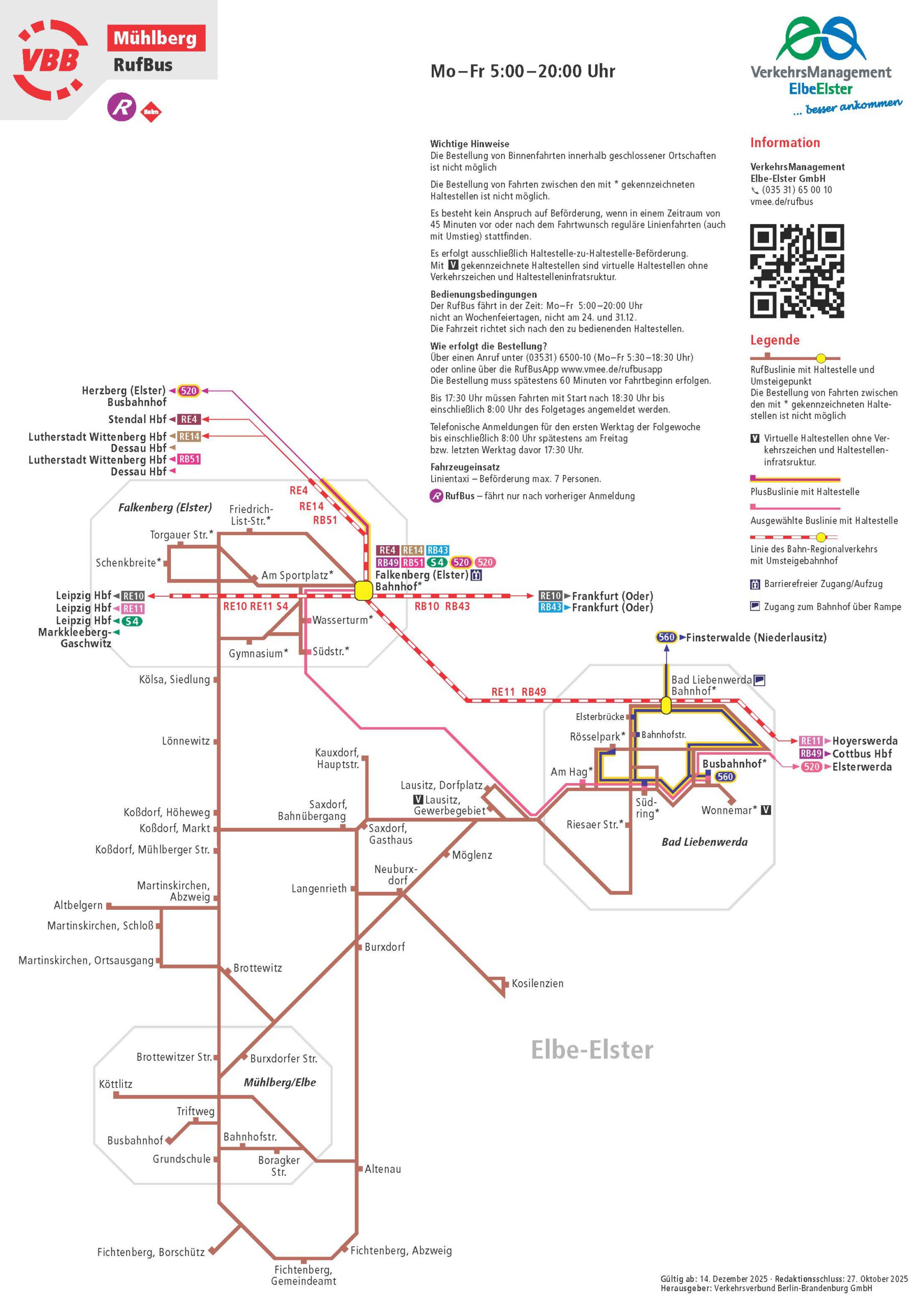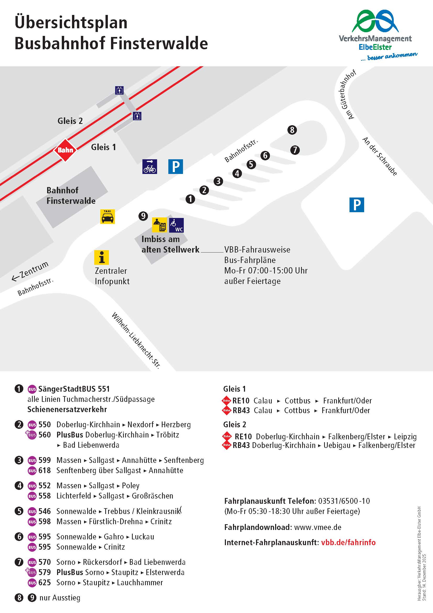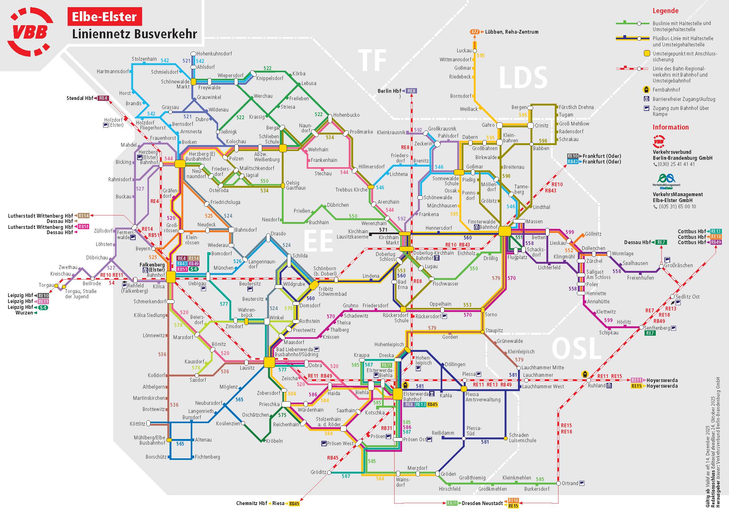 Liniennetzpläne ab 14.12.2025 Liniennetzplan Elbe-Elster Liniennetz SängerStadtBUS 551 (Finsterwalde) Bediengebiet RufBus Schlieben-Schönewalde (R522) Bediengebiet RufBus Mühlberg (R536) Bediengebiet RufBus Röderland (R584) Übersichtspläne wichtiger Haltestellen